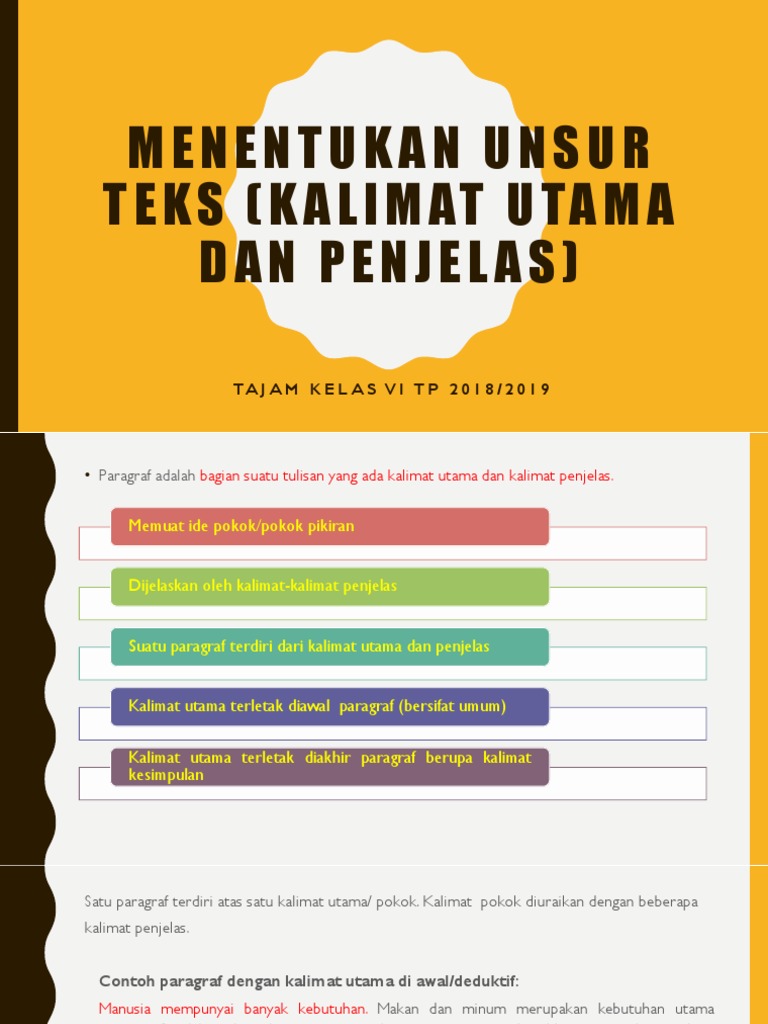 Berisi satu statemen umum tentang topik yang dibahas. Perubahan iklim terjadi di berbagai penjuru dunia, termasuk indonesia. Menentukan unsur teks kalimat utama atau penjelas to download menentukan unsur teks kalimat utama atau penjelas just right click and save image as. Unsur isi atau makna adalah wujud yang dapat dipahami oleh pikiran karena dirangsang oleh unsur bentuk. Nah, kalimat utama ini berisi gagasan utama.